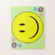 quebra-cabeça de quebra-cabeça de 11" x 14" com uma grande face amarela, grampeadora dos anos 70, e três flores brancas em verde-claro. Veja toda a coleção de Quebra-cabeça Disco 70s nas ATIVIDADES | Seção Quebra-cabeça.