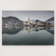 Quebra-cabeça de serra de vaivém com uma cena do inverno com a reflexão da torre de igreja amarela na água imóvel do lago Tegernsee e com neve nos telhados das casas da cidade Rottach-Egern com as montanhas dos cumes atrás dela em Baviera (Baviera), Alemanha.