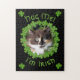 Um gatinho calico de olhos verdes e giros, cercado por quatro trevas de folhas. Me abraça, sou irlandês. Este texto pode ser personalizado no modelo fornecido. Camarões verdes alegres e vibrações positivas para amantes de gatos e quebra-cabeça de todas as idades. Aproveite! Fotografia original e design do Anura Design Studio.