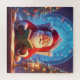 A jolly Santa sits at a desk, candlelit and surrounded by twinkling lights and Christmas trees, reading a green book. Warm, magical, and cozy, it captures holiday family joy.
