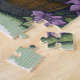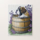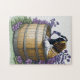 Esta maravilhosa quebra-cabeça de quebra-cabeça apresenta um Santo encantador, o cão Bernard aninhado com dentro a barril rústico no meio de um pano de fundo pitoresco de flores roxas vibrantes.