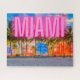 Belo e colorido quebra-cabeça apresenta vista fotográfica de prédios neon iluminados no oceano Miami com palmeiras, céus azuis turvos e grande camada de texto MIAMI rosa-neon