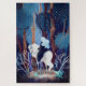 Ilustração digital mostra uma linda mulher em uma capa longa e preta em um cavalo cinza branco, parado em uma colina no meio de uma floresta mágica azul com animais selvagens numa noite escura