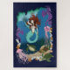 Uma sereia de cabelos vermelhos está entre cavalos-marinhos, peixes-estrelas, tartarugas, águas-vivas e tesouros num pano de fundo azul
