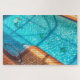 Há uma sereia na piscina de natação, juntamente com algumas outras criaturas marinhas nesta Quebra-cabeça de serra de Jigsera. A fotografia original de ZoeSPEAK é uma vista de cima de uma piscina azul aqua revestida com azulejo azul marinho e terracota, e uma grade de aço curvado. A luz do sol da tarde joga sombras na água espumante. A sereia está feliz.