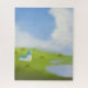 This digital artwork depicts a peaceful, idyllic countryside scene. The image features a gradual transition from a serene blue sky to a lush, green grassy field, with three small buildings or structures scattered throughout the landscape. The use of linear gradients and simple geometric shapes creates a visually appealing and calming atmosphere, inviting the viewer to imagine themselves in this tranquil setting.Created By EsmArt!