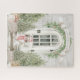 Esta divertida quebra-cabeça de Natal apresenta uma prateleira sentada na varanda vestindo um chapéu de Papai Noel e um cachecol vermelho. A varanda é decorada para o Natal com árvores de Natal iluminadas. O texto na faixa diz "Feliz Howl-Friday". Você pode alterar este texto se preferir.