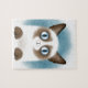 Gato siamês sorridente, de olhos azuis, com fundo azul.