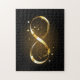 Símbolo infinito de joias Dourado com estrelas douradas sobre fundo preto. Design com estrela dourada.