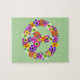 Um sinal de paz floral em tons de rosa, amarelo, laranja, roxo, verde, branco e preto.