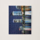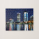 Exposição longa da skyline de Milwaukee na noite, com reflexões fora da água.