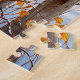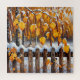 Vibrant orange autumn leaves drape a wooden fence as light snow rests on the rails. Birds perch on branches, creating a peaceful, wintry garden scene by the birch trunks.