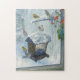 Pintura original do artista Marion Wilcox Fleming. Uma vista da janela do artista. Um grupo de pássaros busca comida durante uma forte queda de neve.