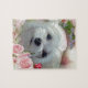 Esta serra de vaivém bonito caracteriza Snowdrop, um cão maltês pequeno doce.