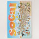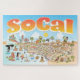 Visão branca e detalhada do sul da Califórnia - apresentando Los Angeles e San Diego e Orange County mais muitas cidades grandes e a maioria das cidades de praia - personagens de zany brincam na praia e no deserto, montanhas e vales. Esta cena encantadora tem tudo - uma surfista pendura dez vezes enquanto uma sereia fica sobre uma rocha, uma baleia assassina salta da água enquanto um t-rex lança um desafio, um casal de praia muscular ambos flex para impressionar, animais de zoológico esperam por turistas e um touro se esmaga em um lutador de touro..