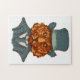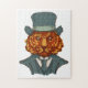 Um tigre que veste um fato teal e um chapéu de cima é representado contra um fundo mudo, dando uma aparência elegante e caprichosa. A expressão séria do animal é enfatizada pelo traje formal.