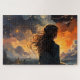Uma jovem moça olha para um pôr do sol laranja brilhante iluminando um céu estrelado em chamas. As nuvens atravessam o horizonte acima de uma cidade fantástica, com pontes, torres e janelas iluminadas. A garota se senta sobre uma colina rochosa com as costas para o espectador, seu cabelo castanho soprando no vento. O movimento nesta imagem é alarmante e uma pessoa não pode deixar de imaginar a sua história.
