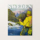 Poster das viagens vintage que promove a pesca e perseguições exteriores na suecia.