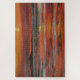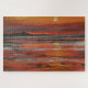 Pintura de um pôr do sol oceânico com laranjas vivas mas tranquilas, vermelhos, azuis e reflexões do sol sobre as ondas.