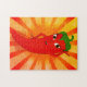 Uma pimenta de desenho animado que se posaria para uma foto. Quebra-cabeça de serra personalizada. Estilo superstar. Estilo de safra aplicado ao impressão.
