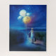 Design de arte incrível de um céu noturno estrelado. Uma garotinha com coxas ouros caminha com uma mala velha em uma mão e balões brilhantes na outra. Cada um dos balões representa um planeta separado no sistema solar. Esta é uma imagem mostrando o futuro ansioso que esta criança tem de onde ela está indo.