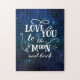 Uma bela imagem aquática de um céu noturno estrelado com a citação tipográfica "Amo-te à lua e às costas". Mantenha sua mente desafiada com este quebra-cabeça maravilhoso ou envie a um amigo ou membro da família para mostrar que você se importa.