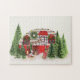 Um quebra-cabeça com um tema de Natal bonito e caprichoso. Um trailer aconchegante decorado para o sorteio de Natal entre alguns pinheiros.