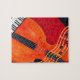 Funcionarios de música e notas flutuam acima de um violoncelo e piano em intensos vermelhos e dourados. O teclado se destaca em contraste com as cores e o fundo escuro.