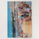 A fotografia original de ZoeSPEAK neste Quebra-cabeça de Jigserra é uma cena típica de verão em Biarritz, França, um destino popular no Golfo da Biscaia, no País Basco. Na época alta, a praia está cheia de pessoas, e a Grande Plage está vestida com essas tendas icônicas de praia, listradas em branco com vermelho, amarelo, verde ou azul. As tendas de cor brilhante acrescentam à atmosfera festiva ao longo da esplanada, com vista ao farol sobre os penhascos, e ao Hotel du Palais ao fundo.