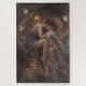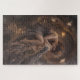 A woman with a flower crown sleeps peacefully inside a hollow tree trunk, surrounded by glowing fairies, a hanging lantern, and magical forest elements like mushrooms and moss.