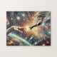 Experience the awe and mystery of creation with this powerful cosmic jigsaw puzzle design, inspired by the timeless symbolism of divine creation reaching across the universe. Two outstretched hands meet in a radiant burst of light, surrounded by galaxies, stars, planets, and swirling cosmic energy, evoking themes of origin, connection, and infinite possibility.