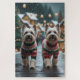 This festive design captures the joyful spirit of the holiday season, featuring an adorable dogs.Nestled in a winter wonderland, complete with a decorated Christmas tree, and beautifully wrapped presents. Snowflakes gently fall, adding a magical touch to the scene, while the vibrant colors of the holiday decorations create a warm and cheerful atmosphere.