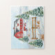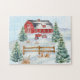 Cena de fazenda de aquarela com celeiro vermelho, trator vermelho, muita neve e pinheiros. Um verdadeiro desafio para o amante da quebra-cabeça.