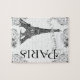 Imagem em preto-e-branco da Torre Eiffel e rolagem do rico. Paris está escrito em impressão forte do lado. design de presentes e cartas adoráveis.