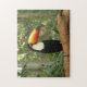 Em uma floresta tropical exuberante, um tucano vibrante percorre graciosamente um galho coberto de musgo, seu bico impressionante e superdimensionado contrastando brilhantemente com a folhagem verdiana. A plumagem iridescente do pássaro e o olhar intenso fazem uma imagem cativante, mostrando a beleza e o fascínio exótico.