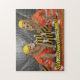 Este quebra-cabeça caracteriza os retrievers dourados vestidos como trabalhadores da construção, guardarando uma chave e um martelo em suas bocas.