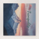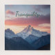 Bonito visão de um pico de montanha com neve com lindas nuvens rosa e roxa com a palavra tranquilidade.