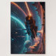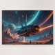 Uma nave estelar voa sobre a superfície de um planeta distante, com estrelas, luas e planetas à distância. Perfeito para quem ama ficção científica e exploração espacial.