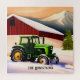O trator verde favorito de um agricultor está estacionado na frente de um celeiro vermelho na neve.