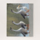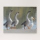Gansos castanhos com estômago branco e pescoço têm um grande botão basal na parte superior da conta. Todos os três estão se esforçando ao longo da borda dos lagos com cabeças erguidas. Ao fundo está um pelicano branco e as águas calmas do lago.