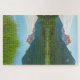 Uma fotografia serena da paisagem captura uma das majestosas cadeias montanhosas das Três Irmãs refletida num lago calmo. Os picos das montanhas, banhados na luz suave de pôr o sol, são um contraste impressionante contra a floresta verde que cobrir suas encostas. A superfície da água age como um espelho, refletindo perfeitamente a silhueta da montanha e a folhagem circundante.