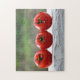 Três tomates vermelhos lado a lado em uma parede branca em frente à natureza verde