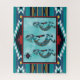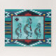 Aproveite este Quebra-cabeça único sudoeste de Kokopelli! Ele apresenta três turquesas no sudoeste de Kokopelli tocando flauta e dançando sob o sol em um fundo turquesa... cercado por uma borda sudoeste em Turquesa, Branco e Ferrugem! Este é um Design de Arte Original do Artista Kerry Miller.