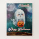 Um fantasma amigável flutua através do ar, carregando uma cesta de doces com o seu truque de abóbora de jack-o-lanterna ou cesto de tratamento. O fundo é um céu noturno escuro de galáxia com algumas estrelas e uma lua de cheio. Design diz "Feliz Dia das Bruxas" e é personalizado com qualquer nome.