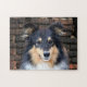 Tricolor Sheltie ou Shetland sheepdog com um quebra-cabeça de fundo de tijolos de cor correspondente
