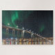 Foto de viagem da Luz Norte (Aurora borealis) acima da cidade de Tromsø, no norte da Noruega, na Escandinávia. A ponte de Tromso no primeiro plano. Local da foto: Tromsdalen.