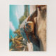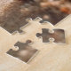 Quebra-cabeça com uma foto de uma tartaruga numa praia arenosa com palmeiras tropicais e o oceano ao fundo.