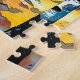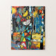 Um gato branco com aparência geométrica, de vidro manchado se encontra em uma floresta vibrante de pássaros. O fundo apresenta uma mistura colorida de folhas de outono e tons de azul e amarelo. Photoshop de arte digital