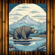 Arte IA representando um urso pardo por um lago nas montanhas com uma lua de cheio ao fundo. As cores utilizadas são castanho, azul e castanho.