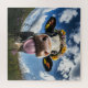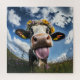 Uma imagem lúdica e aproximada de uma vaca em um prado ensolarado, adornada com uma coroa floral vibrante feita de margaridas e flores silvestres. A vaca põe a língua para fora, acrescentando um toque de humor e charme à cena. O céu azul brilhante e as nuvens suaves no fundo aumentam ainda mais a alegria e caprichosa sensação da imagem.